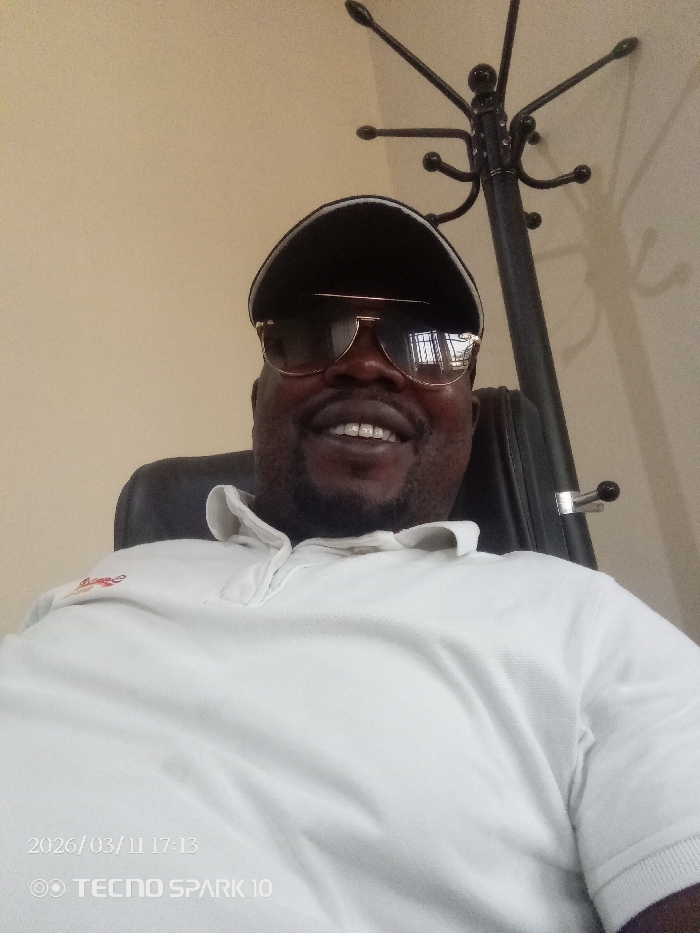 A male individual is depicted in a close-up, chest-up indoor portrait. The subject, an adult male with dark skin, is seated in what appears to be a black office or executive chair, partially visible on the right. He is wearing a black baseball cap with a white brim accent, gold-framed aviator-style sunglasses that obscure his eyes, and a white short-sleeved polo shirt with a visible collar. A small, unidentifiable red emblem or design is present on the left shoulder area of his shirt. The man is smiling, revealing his upper teeth. The background consists of a plain, light beige or off-white wall. To the upper right of the subject, a black, multi-pronged coat stand or rack is partially visible, extending upwards. The lighting is even, suggesting an indoor environment, possibly an office or domestic setting. Overlaid text in the lower left corner indicates "2026/03/11 17:13" and "TECNO SPARK 10". The image provides no specific visual cues to confirm the location as Lokoja, Nigeria; it depicts an interior scene.