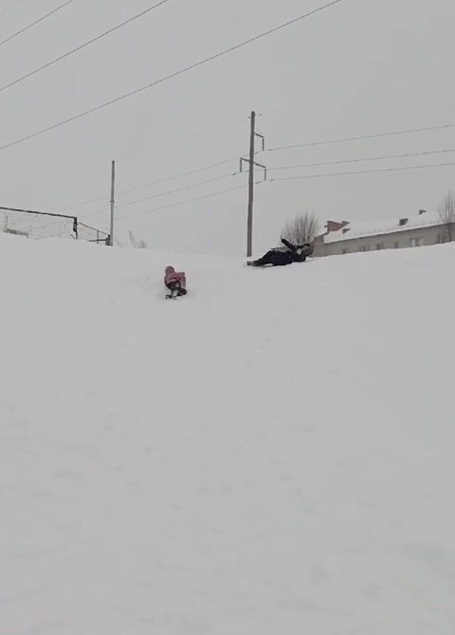 Two people are on a snowy hill. A child in a pink hat and dark clothes is sitting up near the top. An adult in dark clothing is lying on their back further down. They appear to have been sliding down the hill. There is a fence at the top, power lines overhead, and a low building with a peaked roof in the background. The sky is overcast.