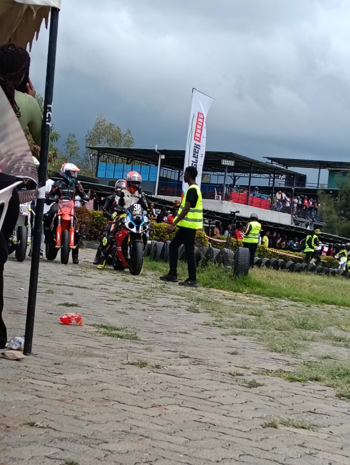 The image depicts an outdoor motorcycling event at a track facility in Matathani ward, Kenya, under an overcast sky