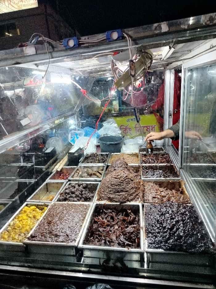 street food stall, likely located in Charfasson Sadar, Bangladesh, a bustling market area. The stall is a glass-enclosed food cart displaying various types of food, likely for sale. Several different types of cooked or preserved goods are arranged in metal containers, including dark brown, light brown, and black substances. A hand reaches into the cart, presumably to pick up a container and prepare the food for a customer. It's nighttime and the stall is lit by artificial light, with the stall owner present but obscured. The stall seems to be crowded and busy with customers. The exterior of the stall appears to be lined with metal, and the interior contains some cleaning supplies. The overhead lighting illuminates the food, making it appear appetizing and inviting. The stall's busy atmosphere and the variety of food suggest a popular and well-established food vendor.