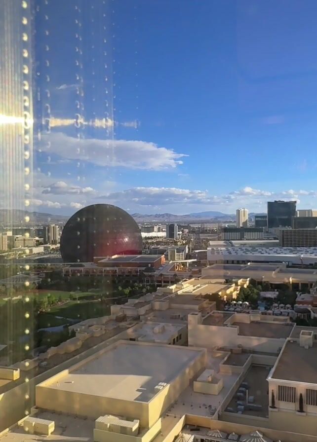 n urban cityscape on a sunny day with a few clouds in the blue sky. Dominating the view is a large spherical structure with a dark outer surface, which momentarily displays a Lenovo advertisement. The camera pans to the right, revealing the Wynn hotel tower, with its distinctive gold and bronze facade. Buildings of varying heights and architectural styles are visible, along with patches of green space. The footage is taken from an elevated position, likely from inside a building looking out through a window, as evidenced by reflections on the glass. The overall scene is a vibrant mix of urban development and natural elements under clear skies.
