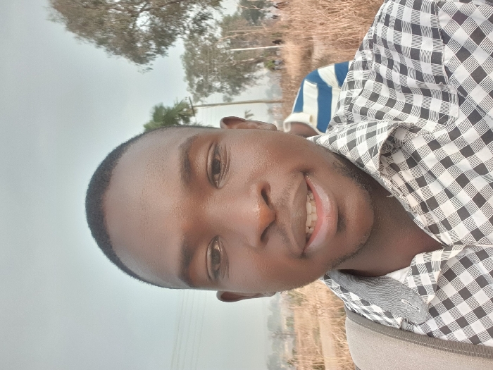 A young man smiles at the camera. He has short, dark hair and a dark complexion. He's wearing a black and white checkered shirt. A person in a blue and white striped shirt stands behind him. The background includes trees, grass, and what appears to be a gray, overcast sky. The overall scene gives a casual and possibly outdoor feel.