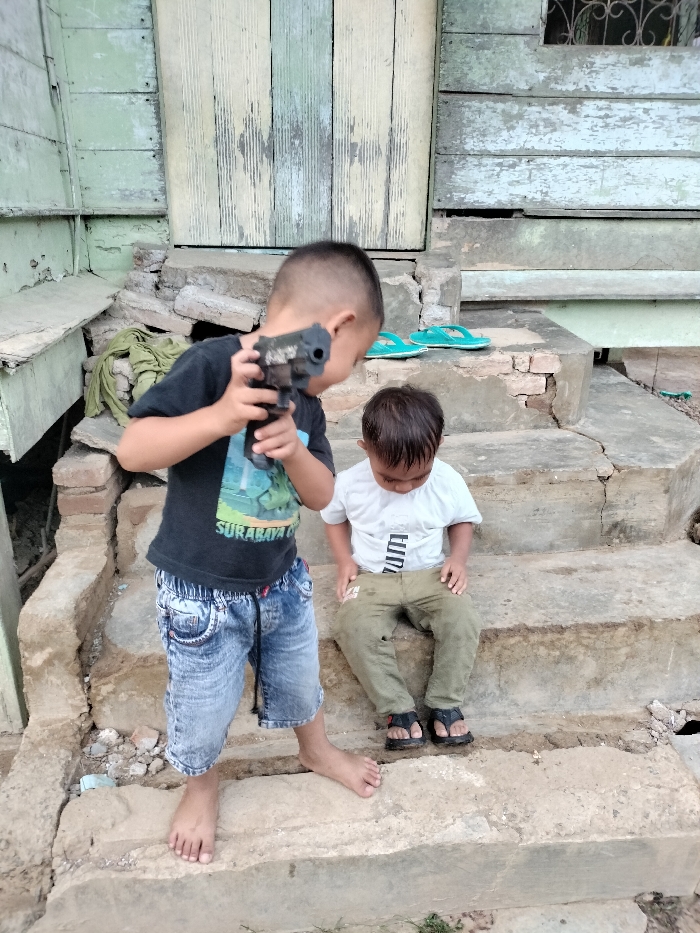 - "The image depicts two young male children on rough concrete steps outside a weathered wooden house in Cutneuheun, Indonesia" by FM-JZ7zm2, licensed under CC BY 4.0