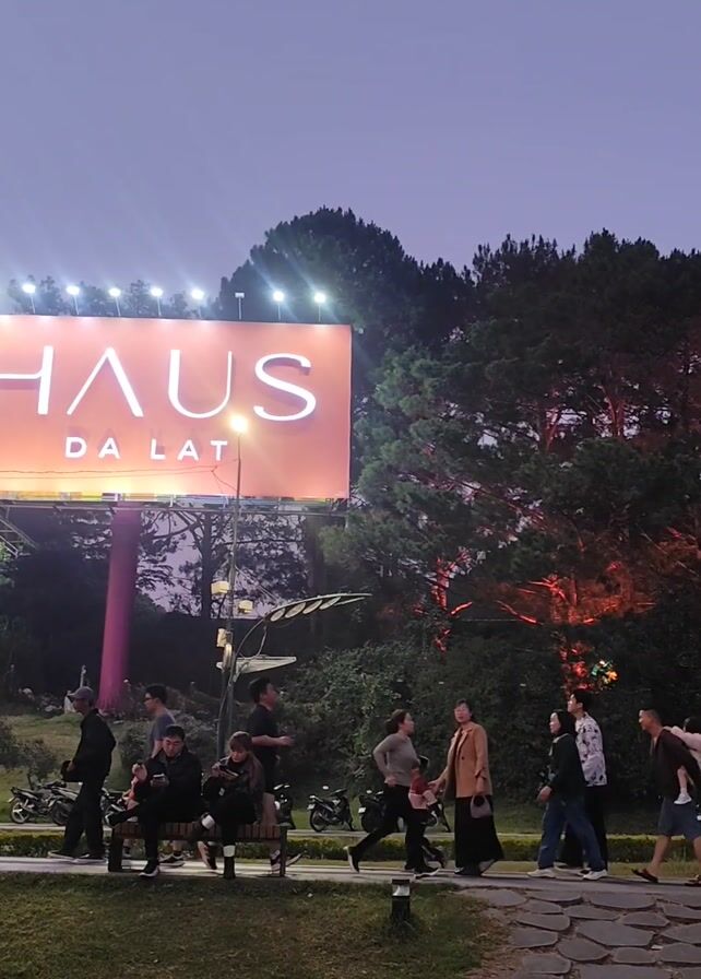 n outdoor scene at dusk or dawn. A large illuminated sign reading "HAUS DA LAT" dominates the left side of the frame. People are walking along a paved path in both directions. A group is sitting on a bench near the sign. Several parked motorbikes are visible in the background. Trees line the background, with some illuminated with reddish light. The sky is a muted blue/grey.