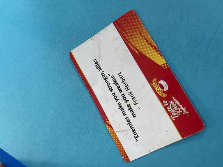 The scene depicts a rectangular, off-white and red card with rounded corners resting diagonally on a uniform light blue-green surface. The top portion of the card features a white background with black text, displaying the quote: "Enemies make you stronger, allies make you weaker." attributed to " - Frank Herbert". The lower section of the card is red, transitioning to yellow and orange hues with a dotted pattern on the right. This red section contains a white teacup logo with "TOP TEA" in yellow/orange text above it, and the slogan "Taste to Know Inspiration" in stylized white script. The card shows signs of minor wear and surface dust or debris, particularly on its white area. A faint blue edge or object is partially visible in the upper left corner of the blue-green background. No individuals are present, nor are any actions or interactions depicted. The environment is indoors. The location is stated to be Ijanikin, Nigeria, though the image provides no discernible features to corroborate this geographical detail.
