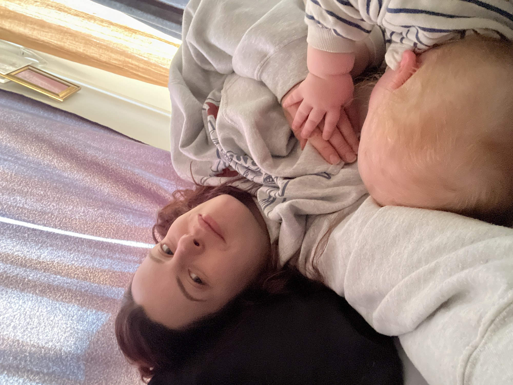 A woman with dark hair is lying on a bed, likely in a residential setting. She wears a light grey sweatshirt. A baby lies partially on her chest, with a pale complexion, fair hair, and wearing a blue and white striped sleeve. The baby's hands rest on the woman's sweatshirt. In the background, near a window, a small picture frame with a gold border sits on a white windowsill. Light from the window illuminates a lavender-colored bedspread. The location in Gangloff, Germany is not clear from the image.