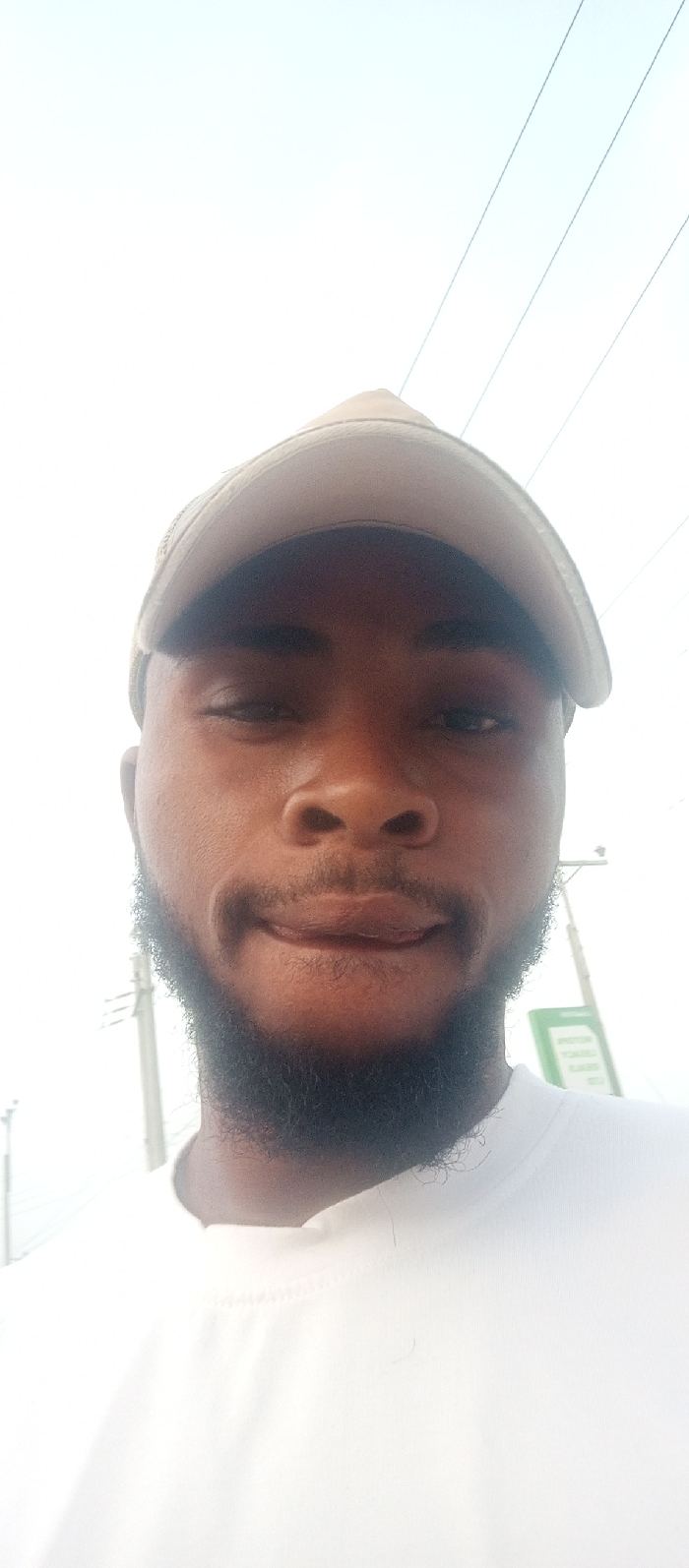 The image presents a headshot of an adult male in Iddah, Nigeria, captured from a slightly low-angle perspective against an overcast sky. The subject, positioned centrally, has dark skin, dark eyes, and a full, dark beard and mustache. He wears a light-colored baseball cap and a white crew-neck shirt. His facial expression is neutral, with a slight upturn at the corners of the mouth. In the background, visible against the bright, light-colored sky, are multiple thin, dark utility wires extending diagonally from left to right across the upper frame. Fragments of two dark utility poles are visible on the left and right sides. A partially obscured green and white sign is situated behind the subject's right shoulder.
