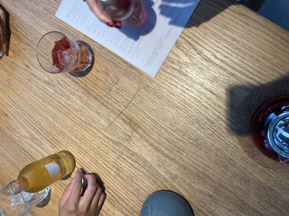 The image depicts an overhead view of a light-colored wooden table at a location in Lordelo do Ouro e Massarelos, Portugal. Strong, directional sunlight illuminates the scene, casting prominent shadows. On the table, arranged for at least three individuals, are various beverages and personal items. In the upper left quadrant, a clear glass tumbler with ice sits beside a glass bottle of "Hari Tea Sun Light" containing a yellow-orange liquid, showing condensation. A hand is positioned near the bottle, holding its silver screw cap. In the upper right quadrant, a clear, faceted glass tumbler holds a red-orange liquid with ice cubes. Adjacent to this, a white sheet of paper with printed text is partially visible. A hand, adorned with dark red nail polish, holds a clear plastic bottle containing a pink or red liquid, obscuring part of the paper. In the lower center-right, a glass teapot or infuser filled with a dark reddish-brown liquid rests on a brown felt coaster. A grey, hemispherical object, possibly a bowl or decorative item, is positioned in the lower left quadrant. The table surface exhibits minor scratches and stains.