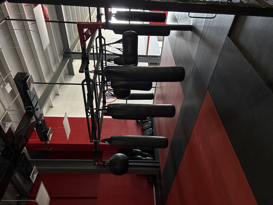A fitness center features several suspended punching bags. The bags vary in size and shape, hanging from a black metal frame. The gym’s interior includes red and black padded walls and flooring, contributing to a high-contrast environment. Exposed ceiling beams and ventilation ducts are visible above. Natural light filters through upper windows, enhancing the gym’s atmosphere.