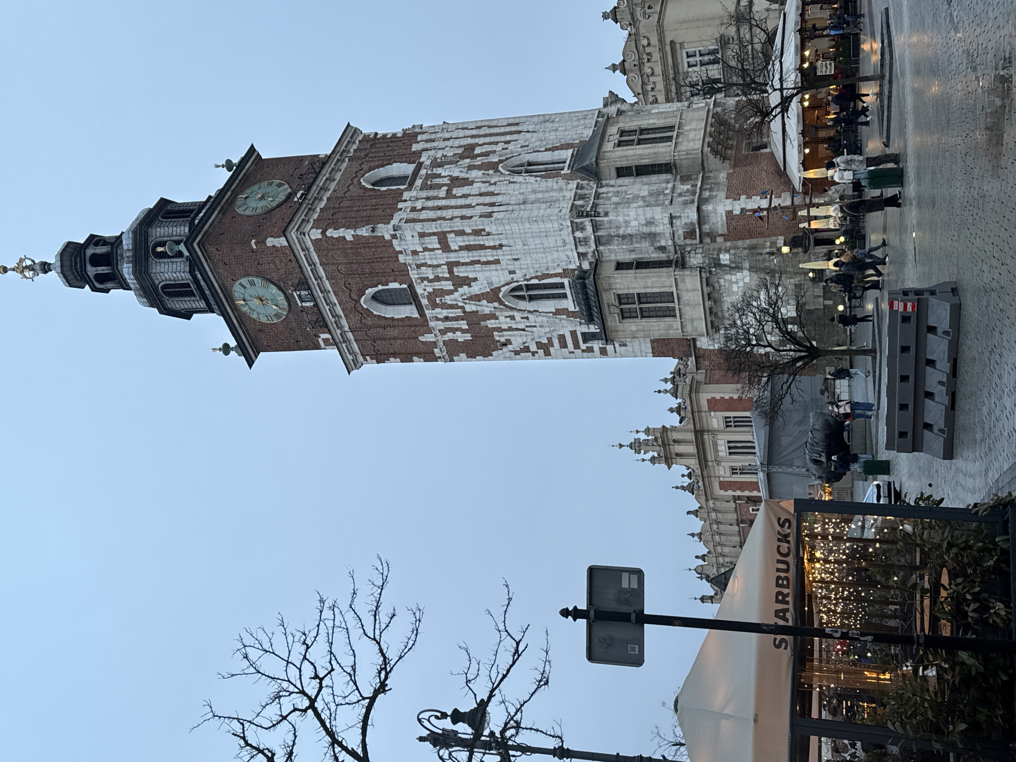 The image captures a view of St. Mary's Basilica in Kraków, Poland. The basilica's distinctive brick and stone tower is visible against a pale blue sky. In the foreground, a Starbucks cafe is partially visible, with its name illuminated in vertical lettering. Pedestrians are seen walking along the square, and trees with bare branches frame the scene. The ground appears wet, suggesting recent rain. A street sign and a lamppost are also visible.