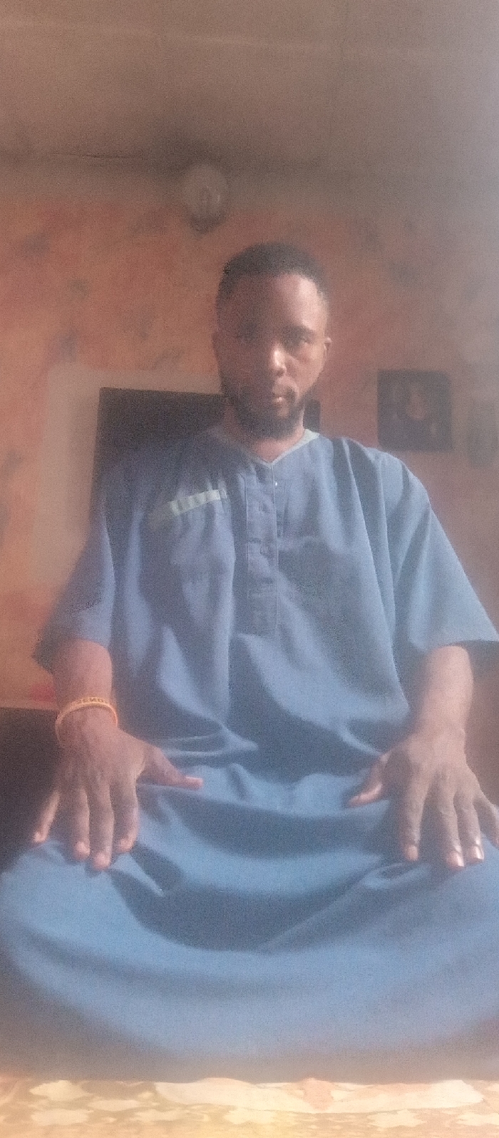 A man is seated with legs crossed, wearing a blue shirt with small buttons at the top. His hands rest on his lap. A gold bracelet adorns his left wrist. Behind him is a wall with a framed picture hanging slightly to the right. A television is also visible behind him. An overhead light fixture is seen near the top of the frame.