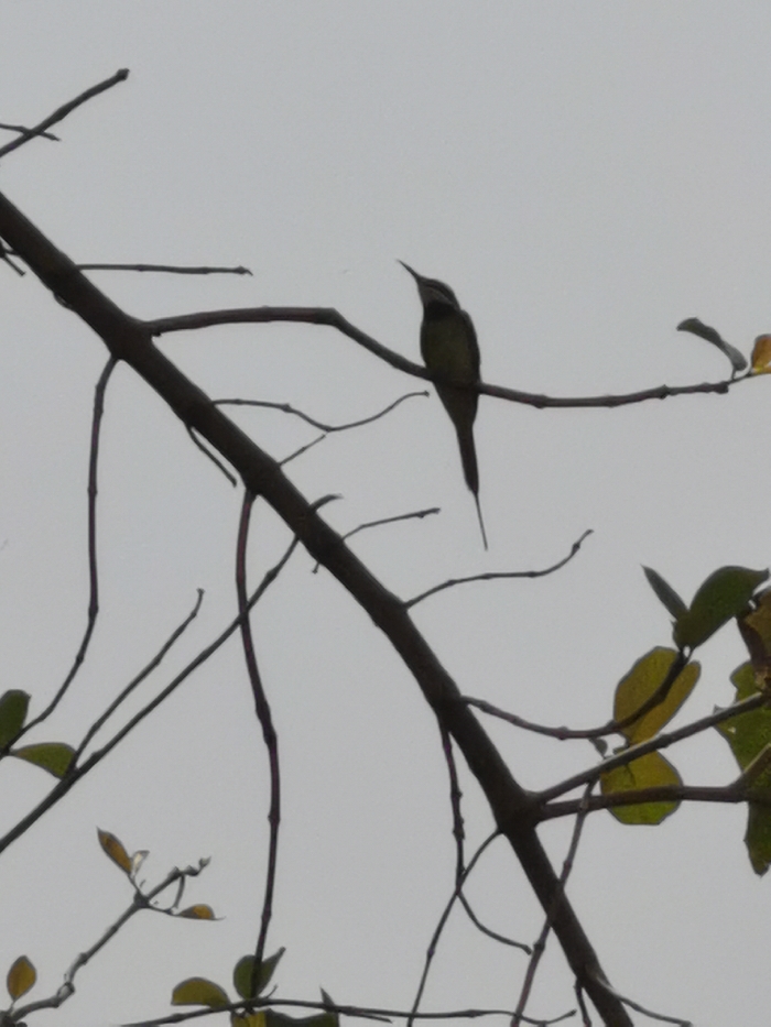 A single slender bird, possibly a bee-eater, with a pointed beak and long tail, is perched on a dark brown tree branch
