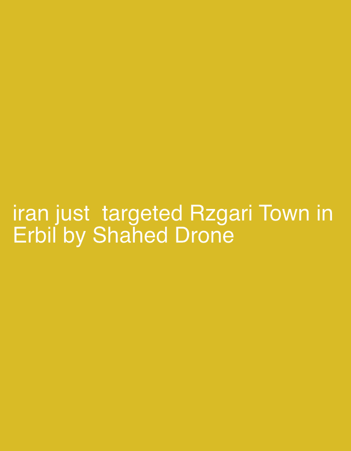 The image displays white text superimposed on a solid mustard yellow background. The text reads: "iran just targeted Rzgari Town in Erbil by Shahed Drone". The image itself contains no visual depiction of people, subjects, objects, actions, interactions, or environmental features. The text explicitly refers to Rzgari Town in Erbil, Iraq, not the city of Sulaymaniyah.