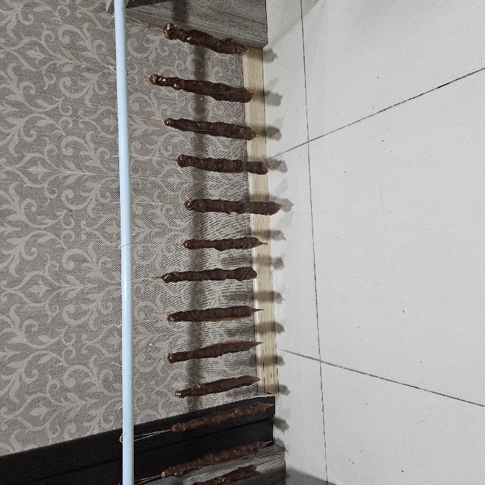 - "An indoor, domestic scene in the city of Unknown, Unknown, depicts approximately fifteen dark-brown, elongated, irregular-shaped food items suspended by individual thin white strings from a horizontal white rod" by FM-oPbvC2, licensed under CC BY 4.0