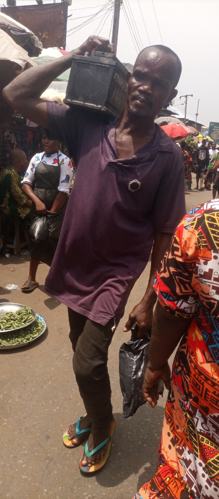 The image depicts a bustling street market scene in Nkpor, Nigeria, under daylight conditions. The foreground is dominated by an adult male with a shaved head and dark skin, seen walking and looking directly towards the camera. He wears a dark purple, short-sleeved collared shirt with an open neckline revealing part of his chest, and dark trousers. A hexagonal, silver-colored pin with a black center is affixed to the left side of his shirt. He carries a dark, rectangular car battery with white markings ("09164312", "ABS") on his right shoulder, secured by his right hand. In his left hand, he holds a black plastic bag. His feet are clad in multi-colored flip-flops with green and light blue straps. To the immediate right of the primary subject, the torso and arm of another person are visible, wearing a brightly patterned garment featuring orange, red, black, and light blue geometric designs. Their hand is seen near the primary subject's left hand. In the mid-ground, to the left of the primary subject, an adult female with dark skin stands behind what appears to be a market stall. She wears a white long-sleeved shirt with colorful butterfly patterns, a dark apron over it, and dark pants. Light brown sandals are visible on her feet. She holds a black plastic bag in her left hand. Next to her, on the ground, a silver metal tray is piled with green, elongated vegetables, with more of the same vegetables arranged below the tray. A partially visible individual in a green and yellow patterned garment is seated further back behind her. The background reveals a busy market environment with multiple indistinct figures, various stalls, and some red awnings or umbrellas. Overhead, numerous electrical wires are strung between utility poles. The ground is an asphalt or concrete surface. The sky appears bright and slightly hazy.