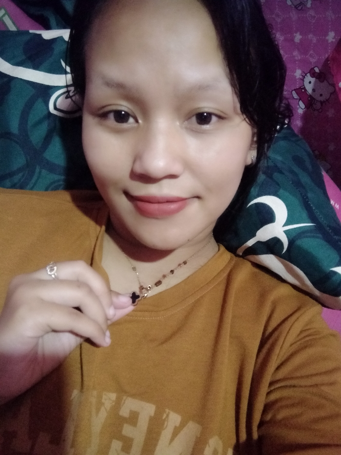 The image depicts a female individual indoors, in a residential setting within Unknown, Unknown. She is presented in a close-up, head-and-shoulders portrait, looking directly at the camera with a slight smile. She has dark hair and eyes, and a light-to-medium skin tone. She wears a mustard yellow long-sleeved shirt with faint white text partially visible on the chest. A silver-colored ring with a clear stone design is on her left ring finger. A delicate gold-colored necklace featuring small flat circular beads and a prominent black four-leaf clover pendant is around her neck. Her left hand is raised, with her fingers touching the black clover pendant. A small silver-colored stud earring is visible in her right ear. The background includes a dark green pillow with a white abstract design positioned behind her left side, and a pink fabric with a repeating white Hello Kitty pattern behind her right side. The scene is evenly lit.