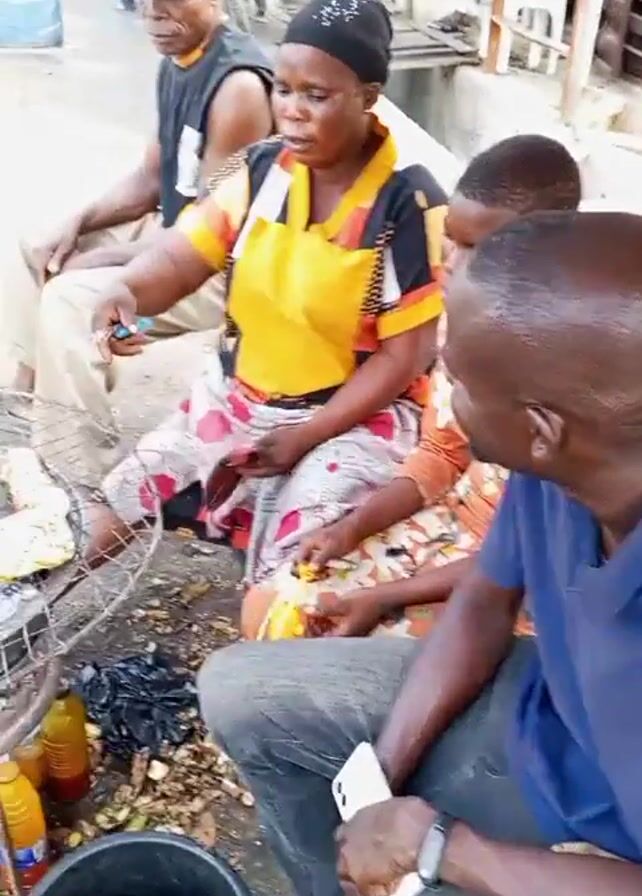 four people sitting outdoors around what appears to be a cooking area. A woman wearing a black head covering and a yellow apron is seated in front of a grill with food on it. Next to her, a young person is peeling what looks like an orange. Another man sits beside the young person, facing the woman, holding a white smartphone. To the woman's left sits another man in a baseball cap. In front of them on the ground is a black bucket containing metal bowls and utensils, along with bottles filled with yellow liquid. The background shows elements of a street or public space, with a motorcycle briefly visible and a structure with bottles. The woman appears to be speaking and gesturing.