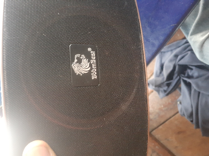 In the city of Unknown, Unknown, an indoor scene is depicted from an oblique, downward angle. The primary subject is a black portable speaker, featuring a textured grille surface and a brown-bronze colored edge. A silver-colored, rectangular emblem adhered to the speaker's grille displays the text "BoomBest®" alongside a stylized lion's head graphic. A human thumb is visible in the upper right portion of the frame, appearing to grip or support the speaker. In the background, to the left and below the speaker, several crumpled fabric items are visible, including a dark blue/grey garment and a lighter blue/grey fabric. A segment of a solid blue object or surface is partially visible beneath the fabrics. The floor beneath these items is composed of light brown/tan tiles with visible grout lines, and minor surface debris is present. The scene is brightly illuminated, with a noticeable glare on the speaker's surface originating from the upper right.