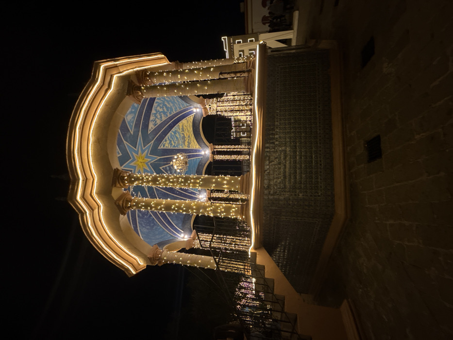 A nighttime view of an illuminated architectural structure, possibly a church or public building. The design incorporates columns adorned with small, warm-toned lights. Above the columns, a semicircular arch is outlined with lights, framing a blue ceiling design with a star motif. A staircase ascends beside the building, also decorated with lights. The building's side is a rough, dark brick wall. The overall scene conveys a festive or celebratory atmosphere.