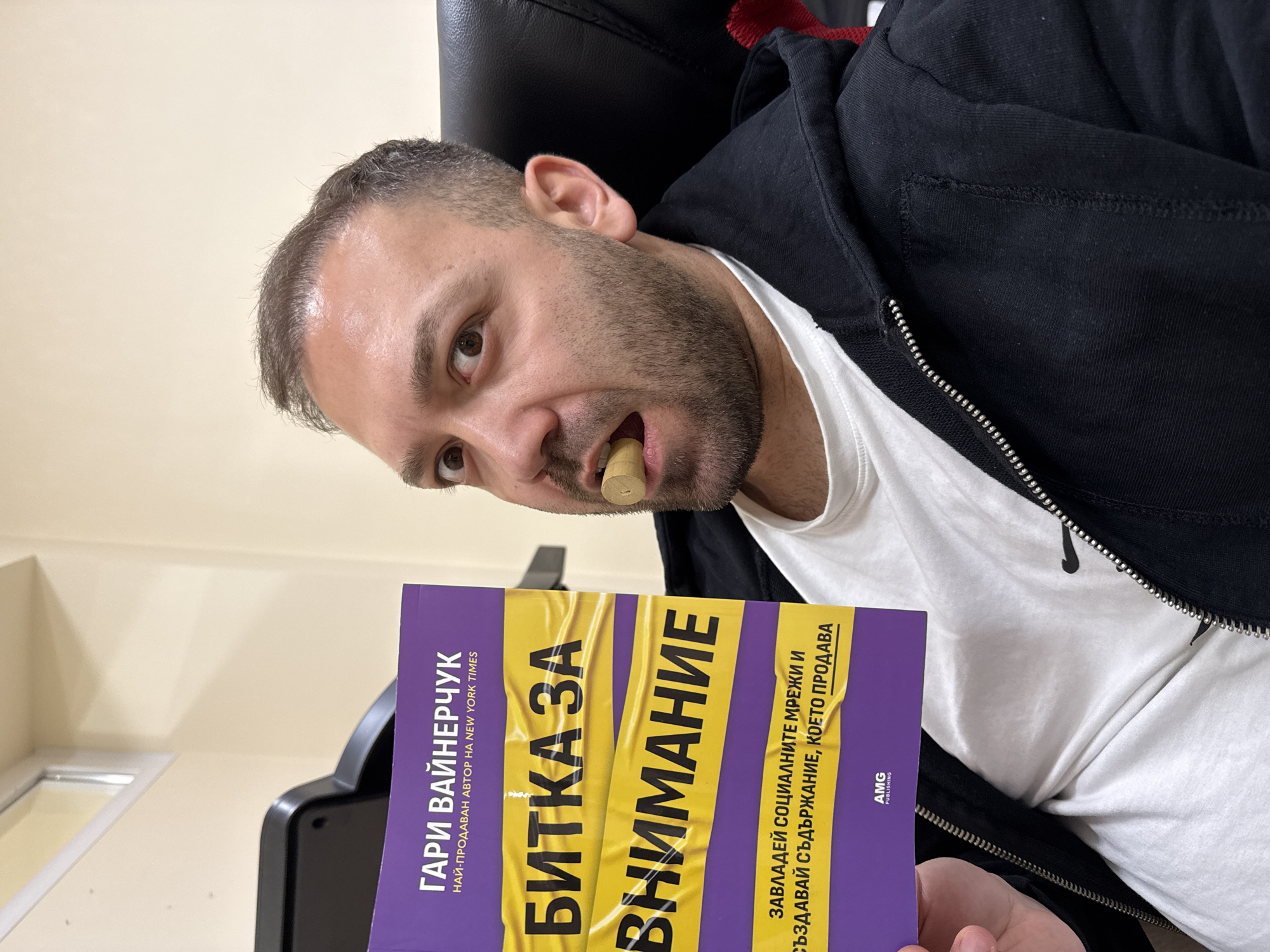 A medium shot shows a man holding a book in his hand while tilting his head towards the viewer. A short, light brown cigarillo is held between his teeth. The man, who has brown eyes and short brown hair with a receding hairline, is wearing a white t-shirt and a black hooded jacket. He appears to be sitting in a black leather office chair. The book is titled "ГАРИ ВАЙНЕРЧУК" in Cyrillic, with the subtitle "БИТКА ЗА ВНИМАНИЕ" (Battle for Attention) highlighted in yellow, indicating it is likely a Bulgarian translation of a work by Gary Vaynerchuk. The background consists of a light beige wall, with a dark object in the periphery. This image was taken in Ruse, Bulgaria.