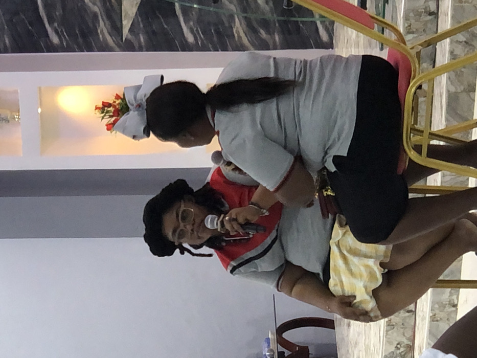 This image depicts an indoor scene in Weija, Ghana, featuring two adult females engaged in an apparent interview or discussion. On the left, a female with a medium-to-heavy build, wearing a black hat over dark dreadlocks and light-framed eyeglasses, is seated. She is dressed in a grey polo shirt with red and black diagonal stripes on the chest and a yellow and white checkered skirt. Her right hand holds a black microphone near her mouth, suggesting she is speaking. On the right, a second female of similar build is seated with her back partially turned towards the viewer. She has dark hair styled in a ponytail, topped with a large light-colored bow. She wears a grey polo shirt with red trim and black shorts or trousers. Her left hand holds a silver microphone, extended towards the first woman. A dark purse rests on her lap. Both individuals are seated on gold-framed chairs with red upholstered seats. The background features a light-colored wall with two illuminated recessed niches; the upper niche contains a gold-colored trophy or vase, and the lower niche holds a bouquet of red artificial flowers. A dark, possibly marble-patterned wall section is visible on the far right. The floor appears to be a light-colored, multi-tiered surface. A partially visible glass table with a water bottle is on the far left.