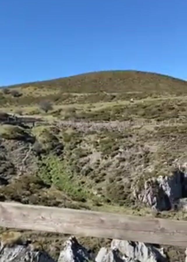 panoramic view of a rocky, mountainous landscape under a clear blue sky. The foreground features a wooden fence, suggesting the perspective is from a viewing point. The landscape is rocky with small vegetation, and the sky is clear. The camera slowly pans across the landscape, revealing more of the rocky terrain and vegetation.