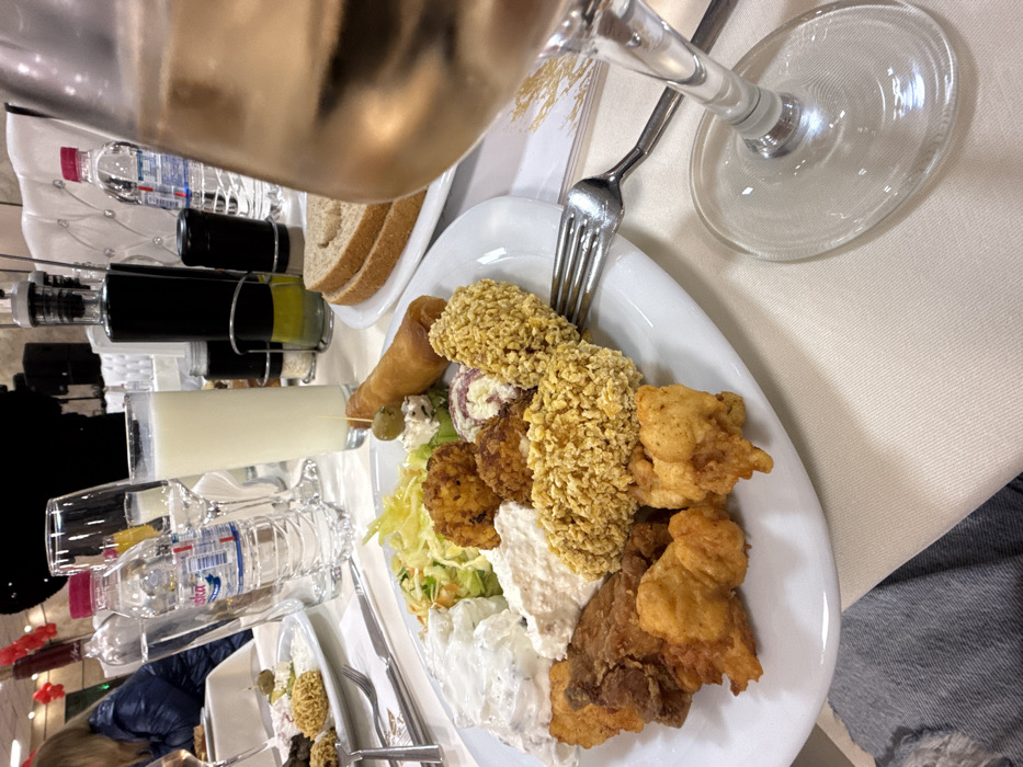 An indoor dining scene is depicted within a restaurant or event hall in Zlatograd, Bulgaria. The foreground features a stemmed glass, likely containing rosé wine, resting on a light-colored tablecloth, partially obscuring the right side of the image. The central focus is a white oval plate laden with assorted food items: several pieces of deep-fried, battered food; multiple nugget-like items coated in a granular, yellow-gold crust; two white, creamy dips or salads; a shredded green and white cabbage salad; and a rolled fried pastry skewered with a green olive on a toothpick. A silver dining fork rests on the plate. In the mid-ground, a table setting includes a plastic bottle of "Devin" mineral water, empty wine glasses, a tall glass containing a white liquid, and a condiment caddy with bottles of olive oil and a dark liquid, alongside salt and pepper shakers. A plate with slices of brown bread is also visible. The background shows a person with blonde hair wearing a blue jacket seated at an adjacent table, partially visible on the left. White upholstered chairs with decorative button tufting are present, and faint red decorative elements are visible in the upper-left background. The tables are covered with light-colored tablecloths.