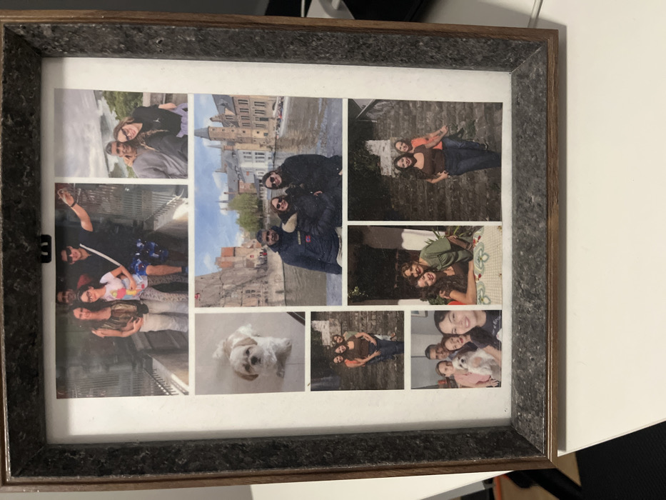 The image displays a framed photo collage containing eight distinct photographs. The frame features a dark, textured inner border, possibly granite, and a lighter, wood-grain outer border. The collage includes diverse scenes: * **Top-Left:** Five individuals (two adult males, two adult females, one girl) are smiling and posing on a bridge or walkway with metal railings. One male gestures with his hand. * **Top-Right:** An adult male and an adult female are depicted smiling outdoors, with a large waterfall and misty landscape in the background. * **Middle-Left:** A small, light-colored dog, possibly a Shih Tzu, with brown patches, sits on a light surface, looking directly at the camera. * **Middle-Right:** Four individuals (one adult male, three adult females) pose by a canal bordered by historic Northern European-style buildings with gabled roofs and brickwork, and a bridge. Boats are visible on the water, identifying the location as Bruges, Belgium. * **Bottom-Left (Upper Segment):** Three adult females are captured posing on old stone steps with a stone wall backdrop, representing a historic urban environment. * **Bottom-Left (Lower Segment):** Five people (two adult males, three adult females) and a small, light-colored dog (similar to the middle-left photo) are gathered and smiling indoors. * **Bottom-Middle:** Two adult females are shown smiling and embracing while sitting at a table adorned with a patterned tablecloth, with foliage visible in the background. * **Bottom-Right:** Two adult females are posing on a wide stone staircase outdoors, against a dark, vegetated background. A location in the city of València, Spain, is represented by the generic stone staircases and stone walls depicted in the upper portion of the bottom-left segment and the bottom-right segment, characteristic of historic urban environments found within districts such as Ciutat Vella.