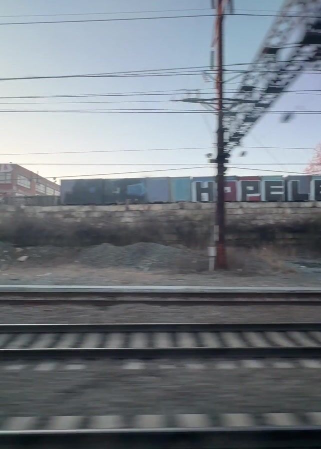 view from a moving train. The focus is on the railroad tracks, which are made of gray metal and have a textured surface. Alongside the tracks, there's a patch of land with debris and some vegetation. In the background, there's a large brick building with graffiti, including the word "HOPELESS" in large block letters. Power lines and supporting structures are visible above. The sky is a pale blue. The camera moves with the train, blurring the foreground details while keeping the background somewhat steady.