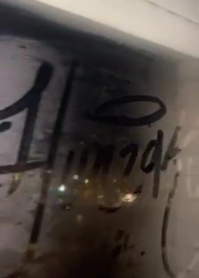 foggy window pane. Black markings are etched into the condensation on the glass. The word "Hunger" is visible in the writing, followed by what appears to be the number "29" and then some obscured characters. Light from an unknown source is visible through the fog, suggesting an outside environment. The window frame appears white. The camera is unsteady, and the image is poorly lit.