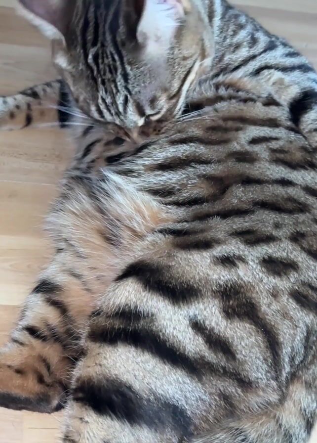 Bengal cat lying on a light-colored wooden floor. The cat is grooming itself, licking its belly with its head bent down. The cat's coat is patterned with brown and black stripes and spots.