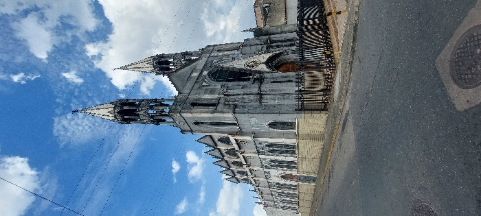 A grand, old cathedral stands tall against a partly cloudy, blue sky. Its gothic architecture, with intricate spires and pointed arches, hints at age and history. A black iron fence lines the building's base. Beside it, a concrete sidewalk meets an asphalt street, marked by a manhole cover. The composition has a somewhat tilted perspective.