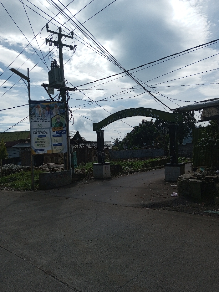 The image depicts an outdoor street scene in Ariyalai, Sri Lanka, under a partly cloudy sky. The foreground features a dark asphalt road exhibiting minor cracks. To the left, a wooden utility pole stands prominently, supporting multiple electrical transformers, a streetlamp, and a dense network of overhead power and communication lines. A large, vertically oriented white banner is affixed to the pole, displaying images of people (likely students and a religious figure) and text in a language resembling Indonesian or Malay, which includes phrases like "MENERIMA SANTRI/SISWA BARU & PINDAHAN" (Accepting New/Transfer Students) and "DARUL FALAH." To the right of the utility pole, an arched gateway, dark green with white-based pillars, spans a narrower unpaved path. The archway also bears text, consistent with the banner's language, identifying it as "PONDOK PESANTREN DARUL FALAH" (Islamic Boarding School Darul Falah). The background beyond the gateway consists of overgrown vegetation, some debris, and rudimentary structures, with distant trees visible under a hazy sky. No individuals are present, and no discernible actions or interactions are occurring.