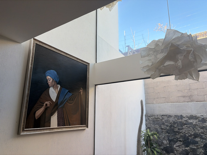 The image depicts an interior architectural space in Tlaxcalancingo, Mexico, providing a view towards an exterior area and the sky. On the left, a framed painting is mounted on a white, textured wall. The painting portrays a woman in profile, facing left and looking downwards, wearing a blue turban, a white undergarment, and a brown and blue draped outer robe. Her right hand is slightly raised with fingers curled, and her left hand holds a fold of the brown robe. The painting features a dark background and is enclosed within an ornate, light-colored frame. Above the painting, white angular architectural elements form part of the ceiling or upper wall structure. To the right, a crumpled white translucent paper ornament hangs from a white horizontal beam. Beyond a window or opening, an exterior wall is visible, consisting of two distinct sections: an upper portion of light-toned concrete blocks and a lower portion of dark, irregular natural stone. Against this exterior wall, a tall, slender columnar cactus and several green leafy plants are present. Above the exterior wall, a clear blue sky is visible, with sparse, bare tree branches in the upper right quadrant of the image. The scene is illuminated by natural light entering from the outdoor exposure.