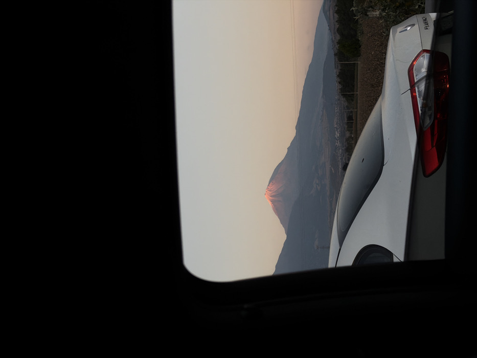 Framed by a dark car window, a picturesque mountain with a sunlit peak is captured beside a white car. The landscape includes trees and possibly houses along the mountain's base. The sky exhibits a muted color palette. The car's tail light is visible, adding depth to the composition.