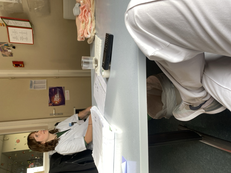 This image depicts an interior scene, specifically within a room located in Tourcoing, France. A female individual with shoulder-length brown hair, wearing a white lab coat over a green top and an identification badge, is seated at a light-colored desk on the left side of the frame. She is looking upwards and to the left, with her forearms resting on the desk. In the foreground, partially visible under the desk, are the lower legs and feet of a second individual, wearing light-colored trousers and sneakers, indicating they are seated opposite the first person. The desk surface, made of a light gray material, holds several objects: a substantial stack of white documents on the left, additional loose papers, a clear glass containing a small amount of liquid resting on a white coaster, a roll of white adhesive tape, and a black remote control. To the far right of the desk, a stack of folded knitted garments, primarily in light pink, yellow, and white, resembling baby clothes, is present, topped with a small gray sock. The background consists of a light beige wall. A closed door with a silver handle is visible behind the seated female, featuring a purple poster with "Star Academy" branding. To the right of the door, a red fire alarm pull station is mounted on the wall. Above the alarm, small items, possibly keys, are hanging. A red clip-frame holding documents is affixed further right on the wall, alongside transparent wall-mounted pockets. To the left of the door, a window provides a view into an adjacent area decorated with colorful cut-outs, suggesting a children's space. Under the desk, a white plastic trash receptacle with a liner is visible. The floor beneath the desk is dark. No direct interaction between the individuals is depicted, but their arrangement suggests a meeting or consultation setting.