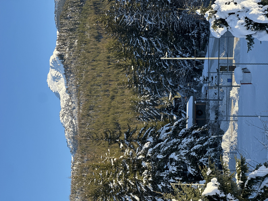 A snow-covered mountain rises against a clear blue sky. A dense forest stretches from the mountain's base, partially covered in snow. A chain-link fence borders a snowy area, next to trees covered in snow. A small building with a rounded roof is visible behind the fence. A pole stretches up above the building. The scene conveys a wintery landscape.