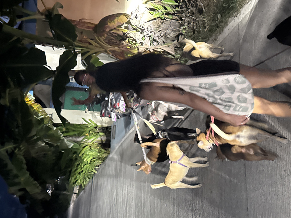The image captures a nighttime scene on a paved street in General Luna, Philippines. In the foreground, a female individual, viewed from behind, walks rightwards. She has long dark hair, wears a black backless top, dark shorts, and carries a light-colored tote bag with a patterned design on her left shoulder. She is accompanied by a group of approximately ten to twelve dogs of various sizes and colors, including tan, brown, black, and grey. Several dogs are equipped with leashes or harnesses. In the background, a second female individual, partially obscured by foliage and the foreground person, stands near two parked motorcycles on the right side of the street. This individual wears glasses, a light-colored top, and is seen waving her right hand. The environment features dense tropical foliage, including large banana plants, bordering the paved surface. Artificial lighting illuminates the scene. The parked motorcycles display visible license plates: one reading "1372L" and another "3952LA". The paved street appears to curve and ascend slightly into the background.