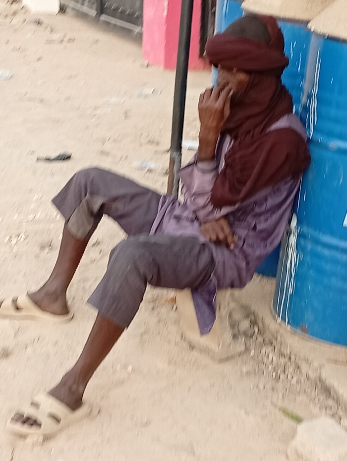 An elderly man sits on the ground, leaning against a blue barrel. He wears a maroon head covering, a purple button-down shirt, and gray cropped pants. His feet are adorned with beige sandals. His right hand is raised to his mouth, possibly in thought or contemplation. The setting appears to be outdoors, with a sandy ground littered with debris. A vertical pole stands behind him, and a glimpse of a pink wall is visible.