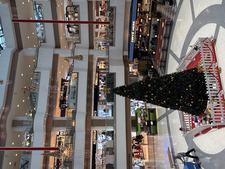 An overhead shot captures the interior of a multi-story mall. Storefronts and escalators are visible on various levels. A large Christmas tree, decorated with ornaments, is prominently displayed near the center of the image, enclosed by a white picket fence and red carpet. A Caffe Nero coffee shop sits beside the tree. Christmas garlands hang from the ceiling, adding to the festive atmosphere. A person with a stroller is near the Christmas tree.