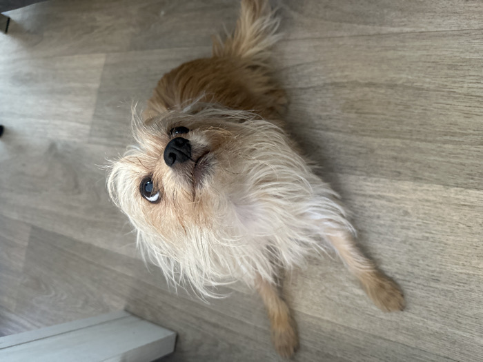 - "A small, shaggy-haired dog with light tan and blonde fur lies supine on a light-toned wooden or laminate floor" by FM-aVDG03, licensed under CC BY 4.0