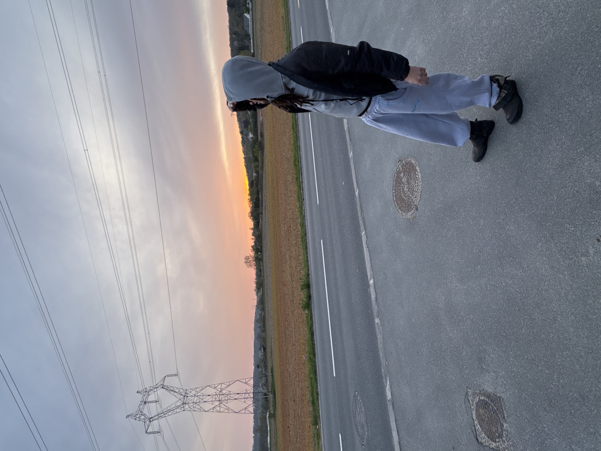 The scene is set in Marcoussis, France, at what appears to be sunset or dusk. A single individual stands on an asphalt road, facing towards the right side of the frame, looking towards the horizon. The person is dressed in a grey hooded sweatshirt with the hood up, a dark jacket worn over it, light grey sweatpants, and dark shoes with visible straps. Their right hand is positioned near their head/hood. The road surface is dark grey and features a solid white line along its edge and a broken white line further inward, indicating a lane. Two circular metal manhole covers are present on the road in the foreground. To the left, a large metal lattice-work electricity pylon is prominently visible, extending upwards with multiple power lines stretching across the sky. Beyond the road is a broad, flat, brown agricultural field. The distant background reveals treelines and scattered buildings. The sky exhibits a gradient from pale blue to orange and pink hues near the horizon, consistent with a setting sun.