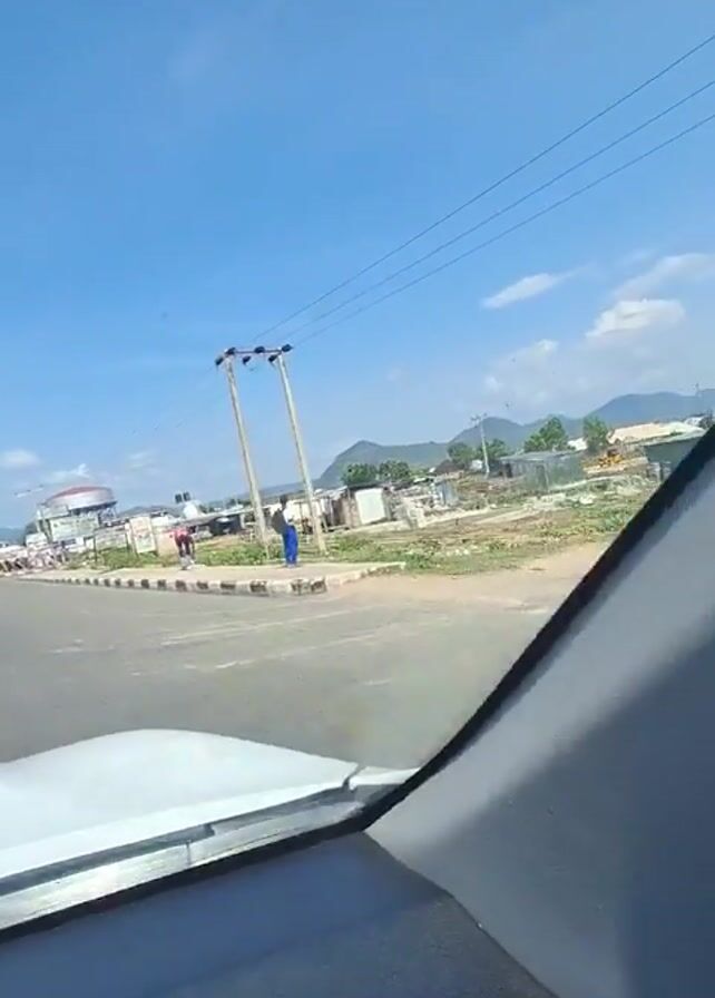 The video, shot from inside a moving vehicle, shows a scene along a road