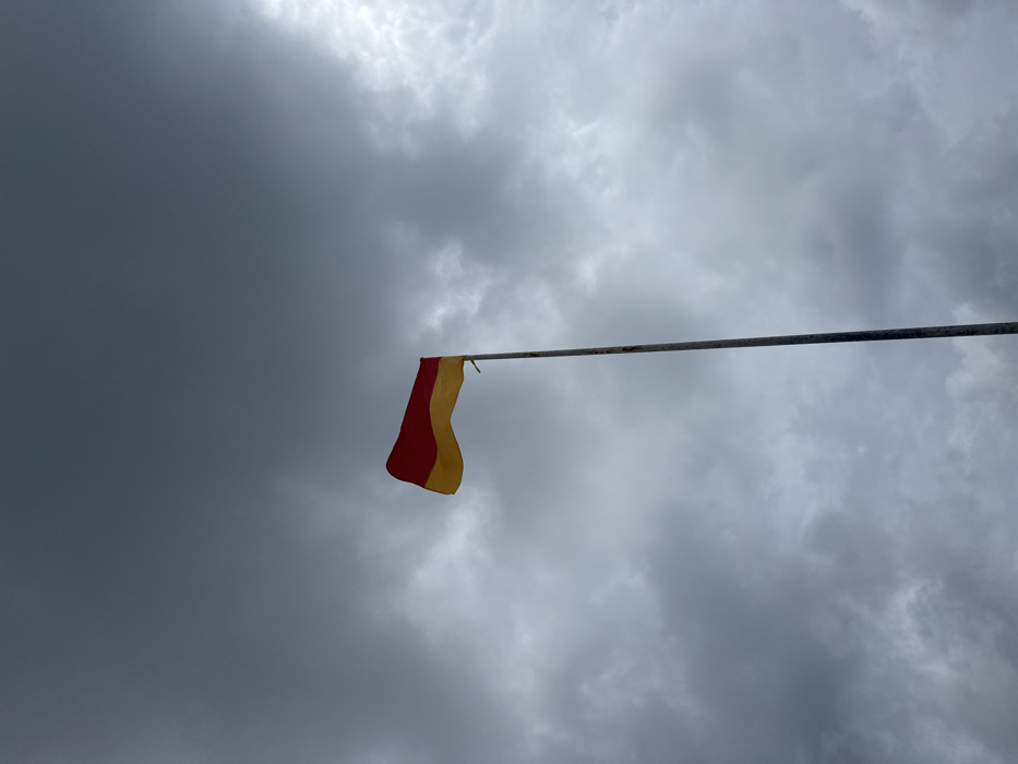 A red and yellow flag hangs limply from a horizontal metal pole. The sky behind is heavily overcast, with dense, dark grey clouds dominating the left side and lighter grey clouds filling the right. The flag is positioned towards the right of the frame, contrasting against the threatening sky. The scene suggests a potentially stormy or unsettled weather condition.