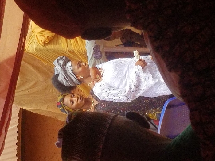 The image captures an outdoor or semi-outdoor gathering in Ochadam, Nigeria, observed from the perspective of two individuals partially visible in the foreground