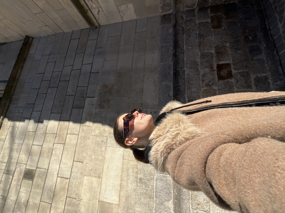 A single individual is depicted in a medium-shot, positioned against a large stone wall, in Lille, France. The person, appearing female, has light-toned skin, hair pulled back into a ponytail, and wears tortoise-shell pattern sunglasses. She is dressed in a textured, light brown coat featuring a prominent, fluffy, light-colored fur collar, with a black zipper and drawstrings visible. Her head is tilted slightly upward, and she looks towards the right. Strong sunlight illuminates the right side of her face and coat, creating a stark vertical shadow that runs down her left side and continues onto the stone wall behind her. The background wall is composed of two distinct sections: an upper part with large, light-colored rectangular stone blocks, and a lower part with smaller, darker, and more irregularly cut stone blocks. A sharp vertical shadow line clearly divides the sunlit and shadowed portions of the wall. The architecture suggests a historical stone building.