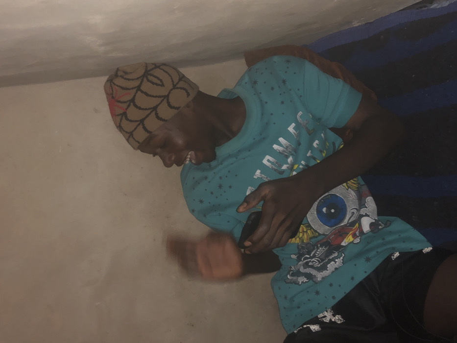 A young individual, appearing to be male with dark skin, is depicted reclining indoors against a light brown, textured wall in a corner of a room in Dutsinma B, Nigeria