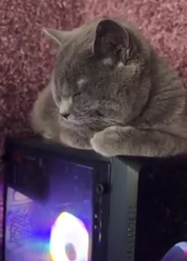 A gray cat is resting on top of a black computer tower. The computer tower has a glass side, revealing interior components illuminated with bright blue and purple LED lighting. The cat is curled up with its eyes closed, appearing to be asleep. The background is a textured pink or purple wall. The camera slowly zooms in.