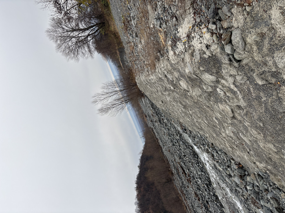 A grey sky overlooks a long landscape shot from a high angle. Trees with bare branches line the horizon. The foreground is dominated by rock and gravel, with a narrow stream cutting through it. The overall tone is muted and cold, indicative of a winter or late autumn scene.
