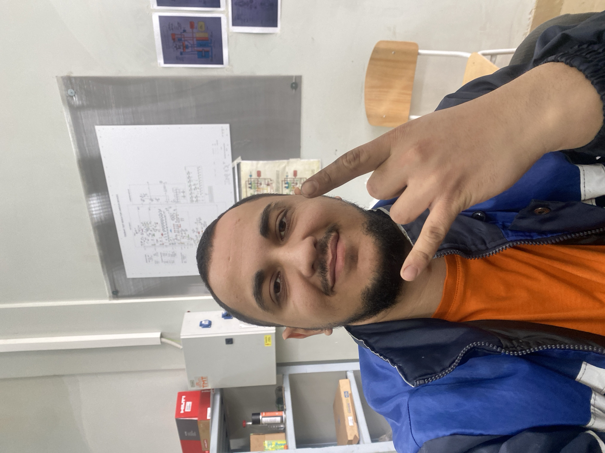 A person with dark hair and a beard, wearing an orange t-shirt and a blue jacket, is holding up a "rock on" hand sign. The background includes a white wall, an electrical diagram, a gray metal sheet, and a wooden chair. In the lower part of the image, there are boxes and shelves containing spray cans and other objects. The location is not specified, and it is not possible to determine if it is in Ruse, Bulgaria from the image.